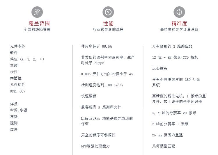VI 5K 3D AOI 光學檢測機 使用率超過99.5% 檢測速度達到100cm2/s 快速編程 LibraryPro 功能是優異表現的保證 完全的程序可移植性 幾何模型匹配
