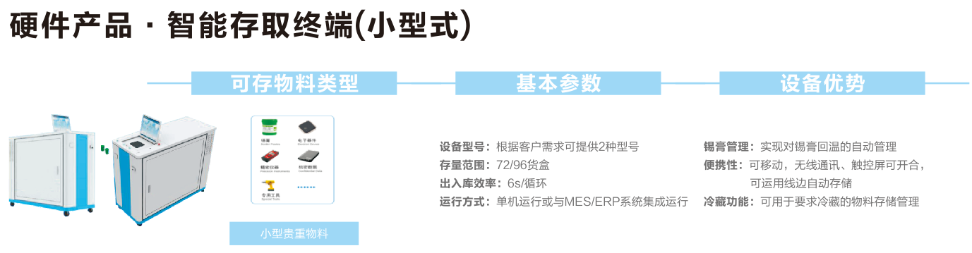 小型一對一智能存取終端,可實現對錫膏回溫的自動管理,可移動,無線通訊、觸控屏可開會,可運用線邊自動存儲。可用于要求冷藏的物料存儲管理。