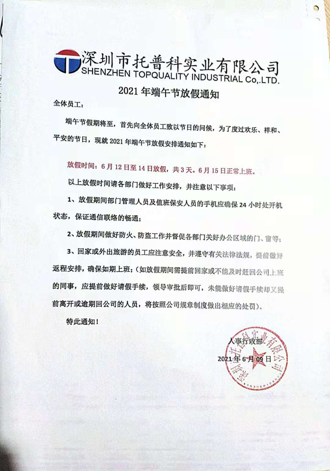 深圳托普科實業2021端午節放假通知